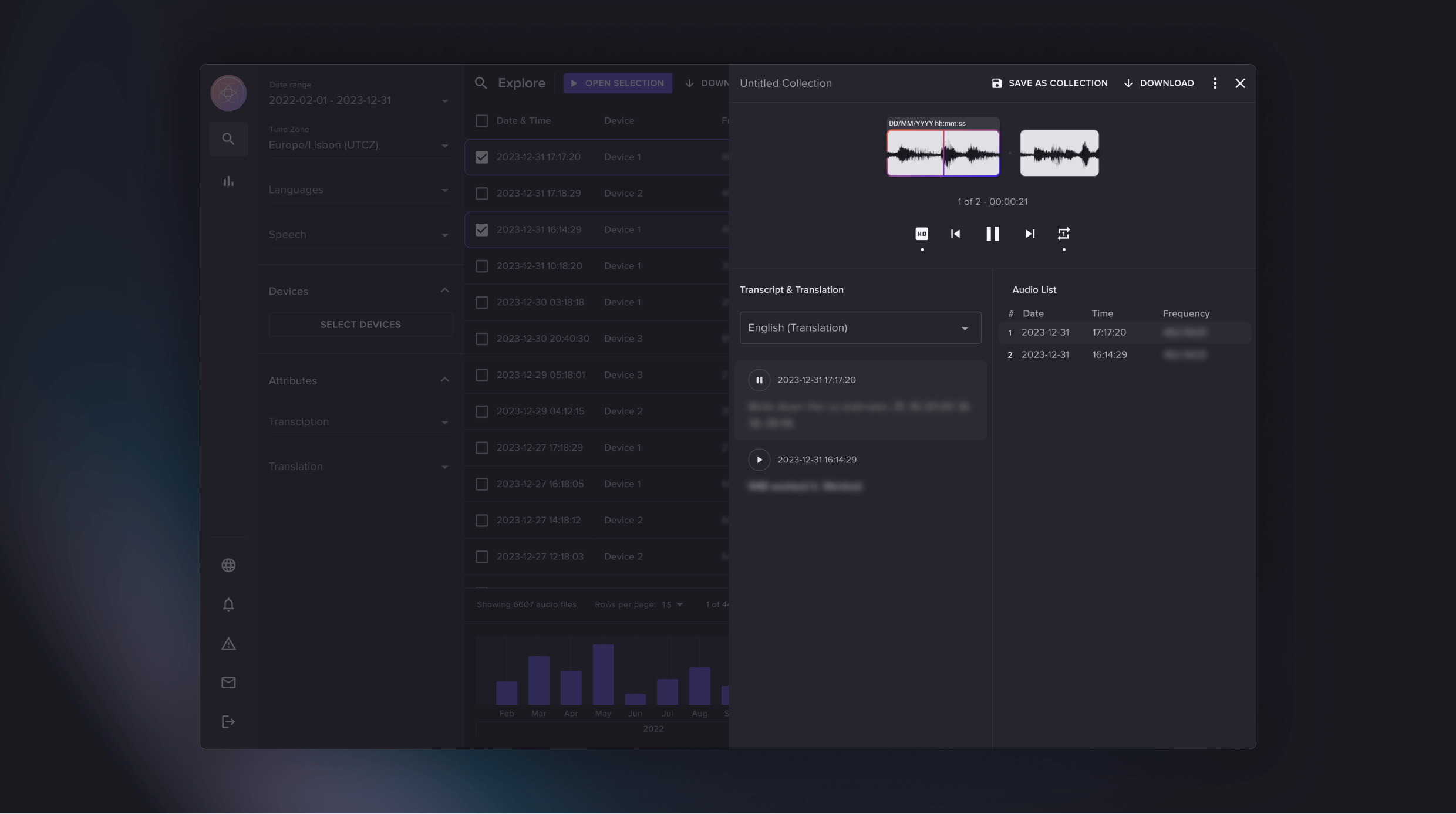 Find incriminating audio quickly by filtering time, date, language, transcription/translation status and keyword search